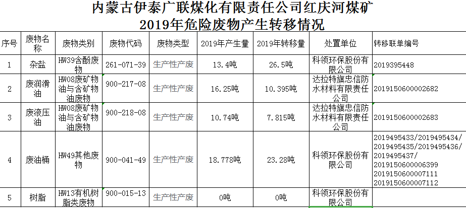 关于内蒙古伊泰广联煤化有限责任公司红庆河煤矿2019年度危险废物产生转移的公示 <span>发布时间:2020-07-29</span> | <span class="views">关注:<b id="viewCountId">2616</b></span> | <a href="javascript:void(0)" class="print"><i class="ion"></i></a> 危废联单.pdf 返回列表 上一条 下一条