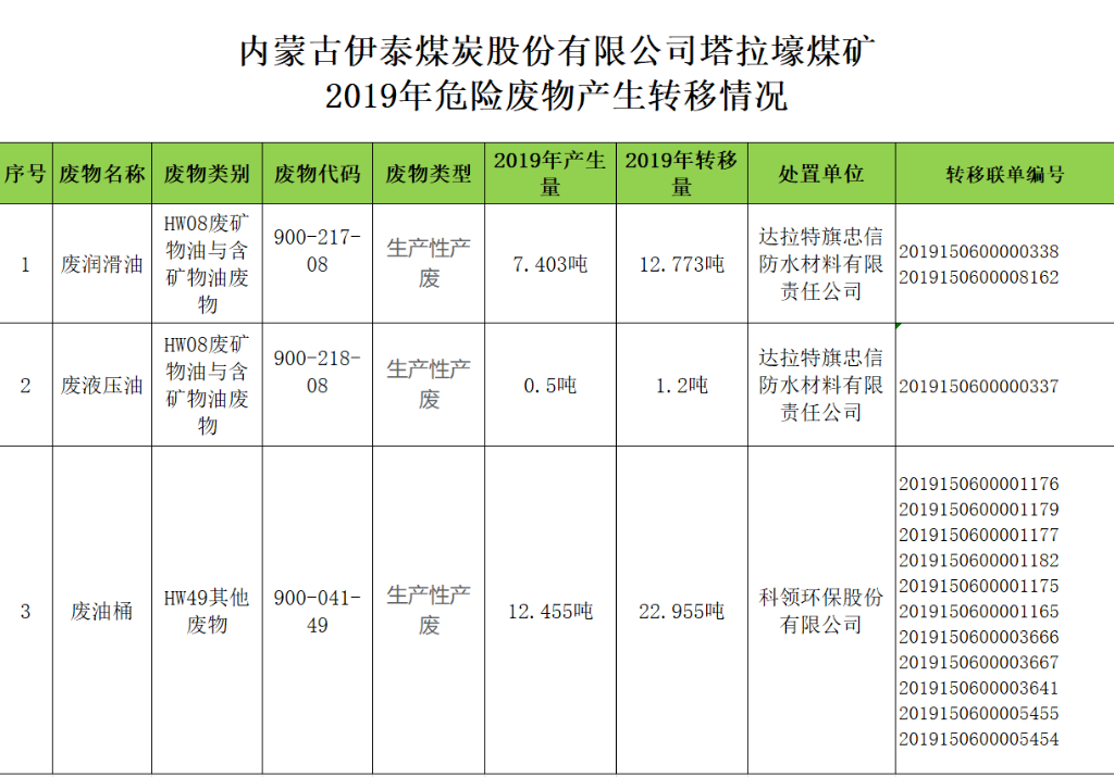 内蒙古伊泰煤炭股份有限公司塔拉壕煤矿2019年危险废物产生转移情况
