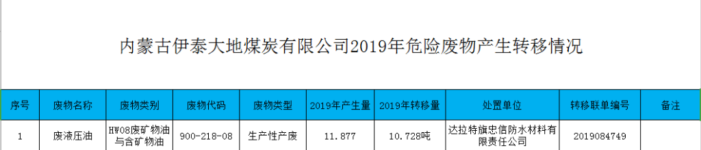 内蒙古伊泰大地煤炭有限公司2019年危险废物产生转移情况 <span>发布时间:2020-08-06</span> | <span class="views">关注:<b id="viewCountId">4152</b></span> | <a href="javascript:void(0)" class="print"><i class="ion"></i></a> 大地精煤矿2019年危废转移联单.pdf 返回列表 上一条 下一条