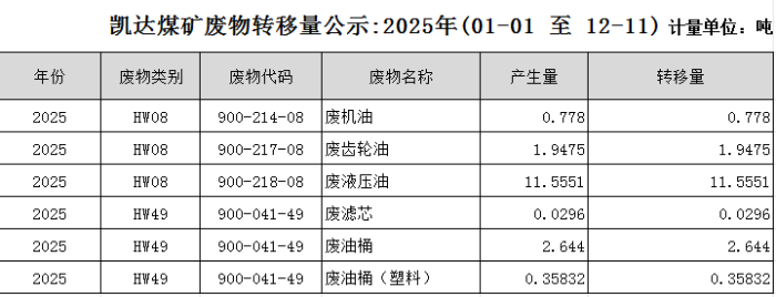 凯达煤矿废物转移量公示:2025年(01-01 至 12-11) <span>发布时间:2025-12-17</span> | <span class="views">关注:<b id="viewCountId">72</b></span> | <a href="javascript:void(0)" class="print"><i class="ion"></i></a> 返回列表 上一条 下一条